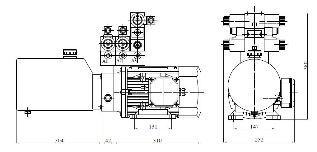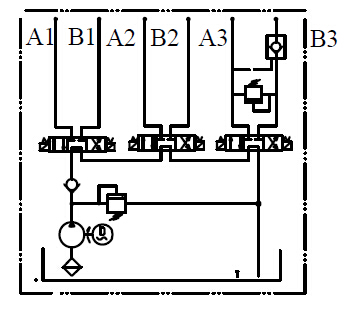 此液壓動(dòng)力單元由高壓齒輪泵、交流電機(jī)、多用集成塊、液壓閥、油箱等零部件有機(jī)結(jié)合為一體。為汽車扒胎機(jī)設(shè)計(jì),控制三組雙作用油缸。