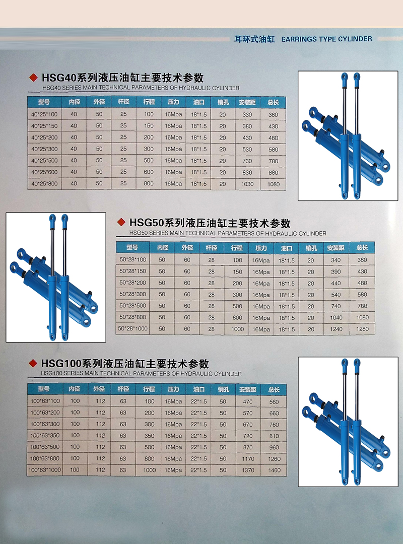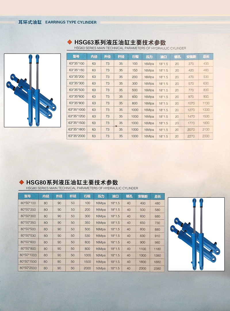 HSG系列工程液壓缸為雙作用單活塞桿液壓缸;安裝方式多采用耳環(huán)型,按缸蓋與缸體連接方式不同有外螺紋連接、內(nèi)卡鍵連接及法蘭連接三種。工程液壓缸主要用于工程機械、重型機械、起重機械及礦山機械等液壓系統(tǒng)中。